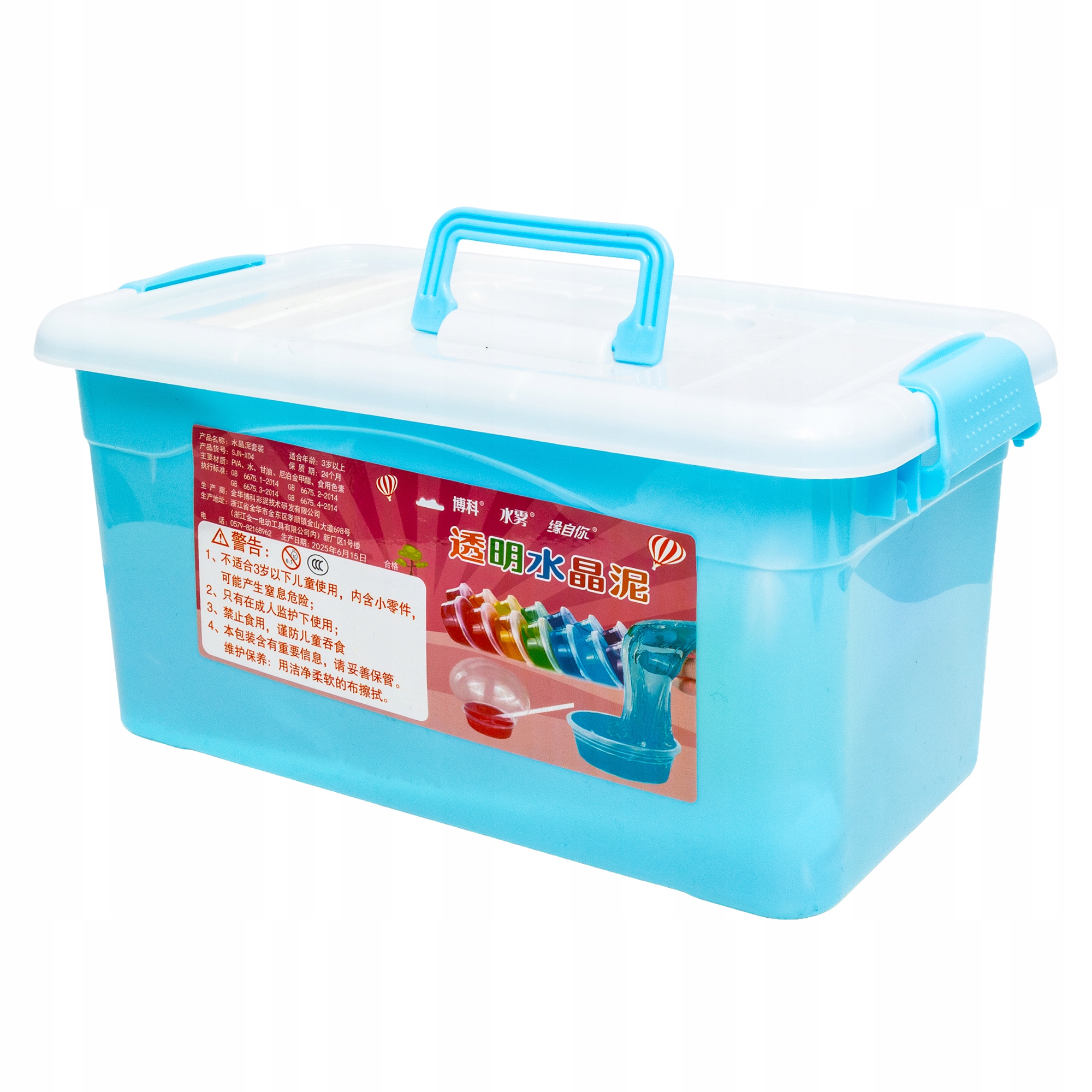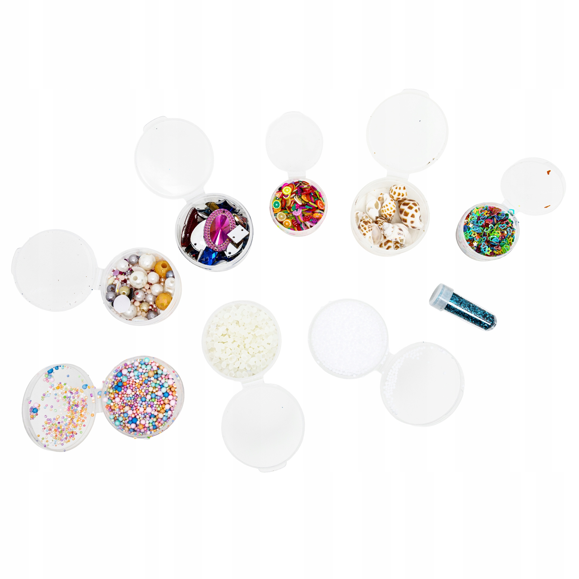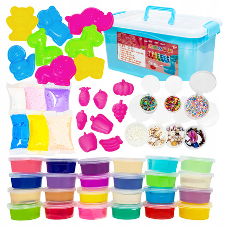 W pudełku znajduje się wszystko, czego potrzeba, by tworzyć niepowtarzalne masy – od kolorowych slime’ów, przez brokaty, koraliki, kulki, aż po foremki i narzędzia do modelowania.