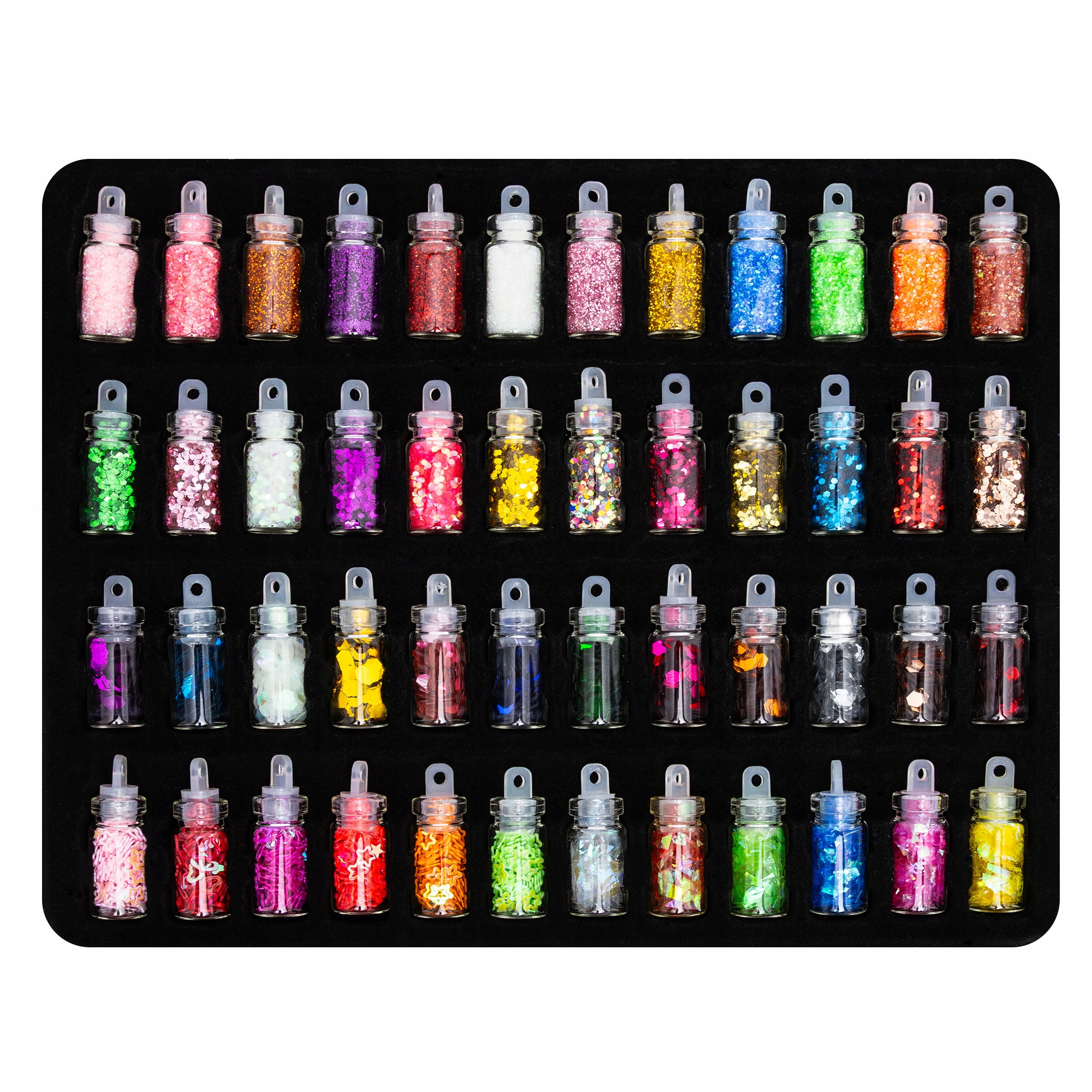 - 48x fiolki z dekoracjami; brokat, perełki, konfetti, cekinki, cukier, kryształki – losowe wzory i kolory
